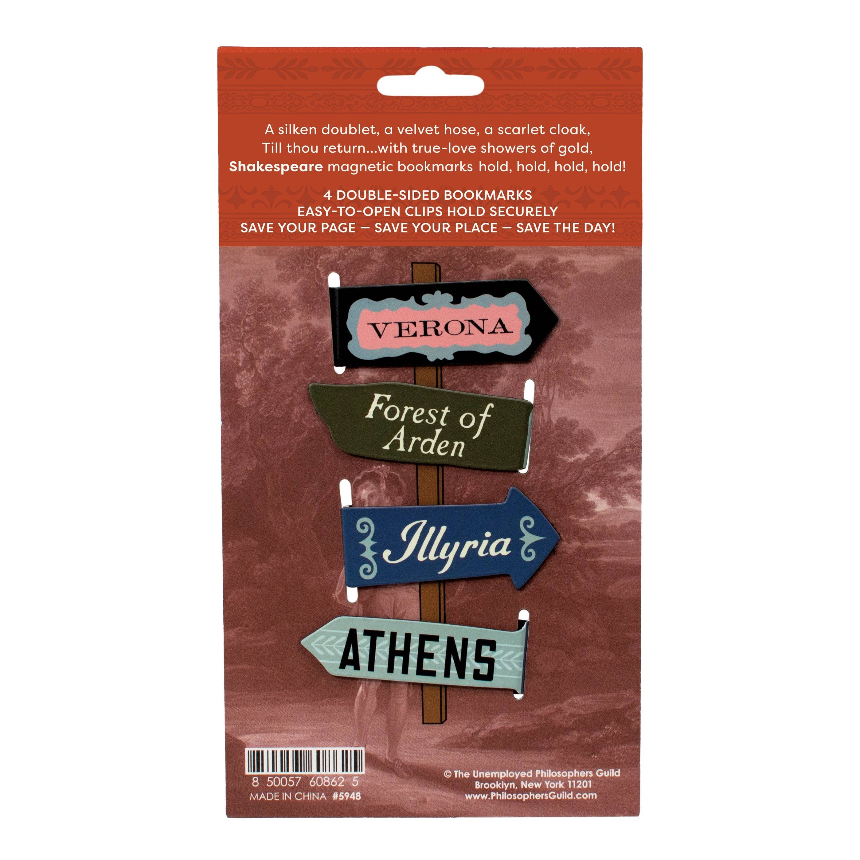 Mark your page with a touch of theatrical flair using this charming set of magnetic bookmarks celebrating Shakespeare's most famous worlds. From the tragic halls of Elsinore to the romantic streets of Verona, each of the four double-sided designs transports you to a beloved setting from the Bard's greatest works. The secure magnetic clips won't slip or slide, keeping your spot safe and sound no matter how long you're away from the page. A delightful companion for any Shakespeare lover's reading journey.