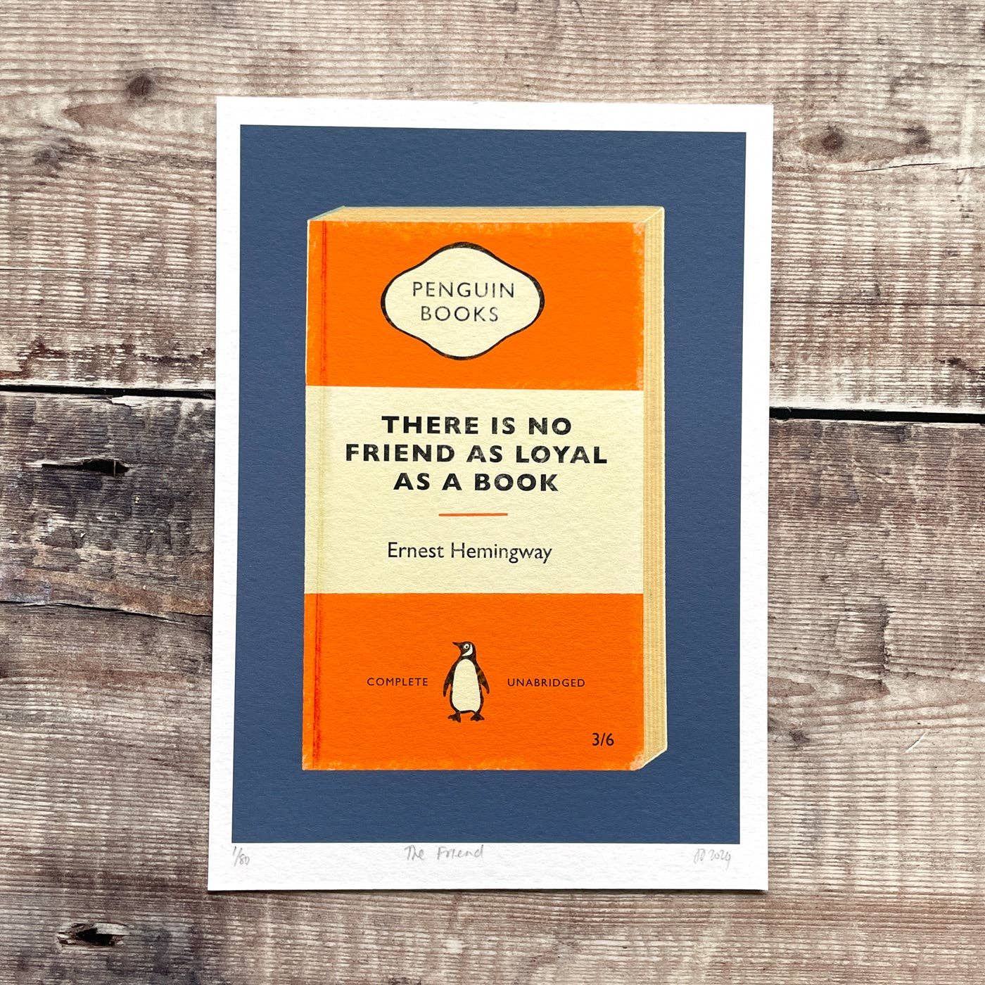 This charming limited-edition Giclee print pairs Ernest Hemingway's witty observation about literary companionship with the beloved Penguin Tri-band book design. Produced in Design Smith's studio on archival Cotton Rag 315gsm paper using long-lasting pigment inks, it's built to outlast most friendships—guaranteed vibrant for over 85 years. Each of the 80 prints arrives signed and numbered, making it a collectible treasure for bibliophiles who understand that books truly are life's most dependable mates. A5 size, ready to brighten any book lover's space.