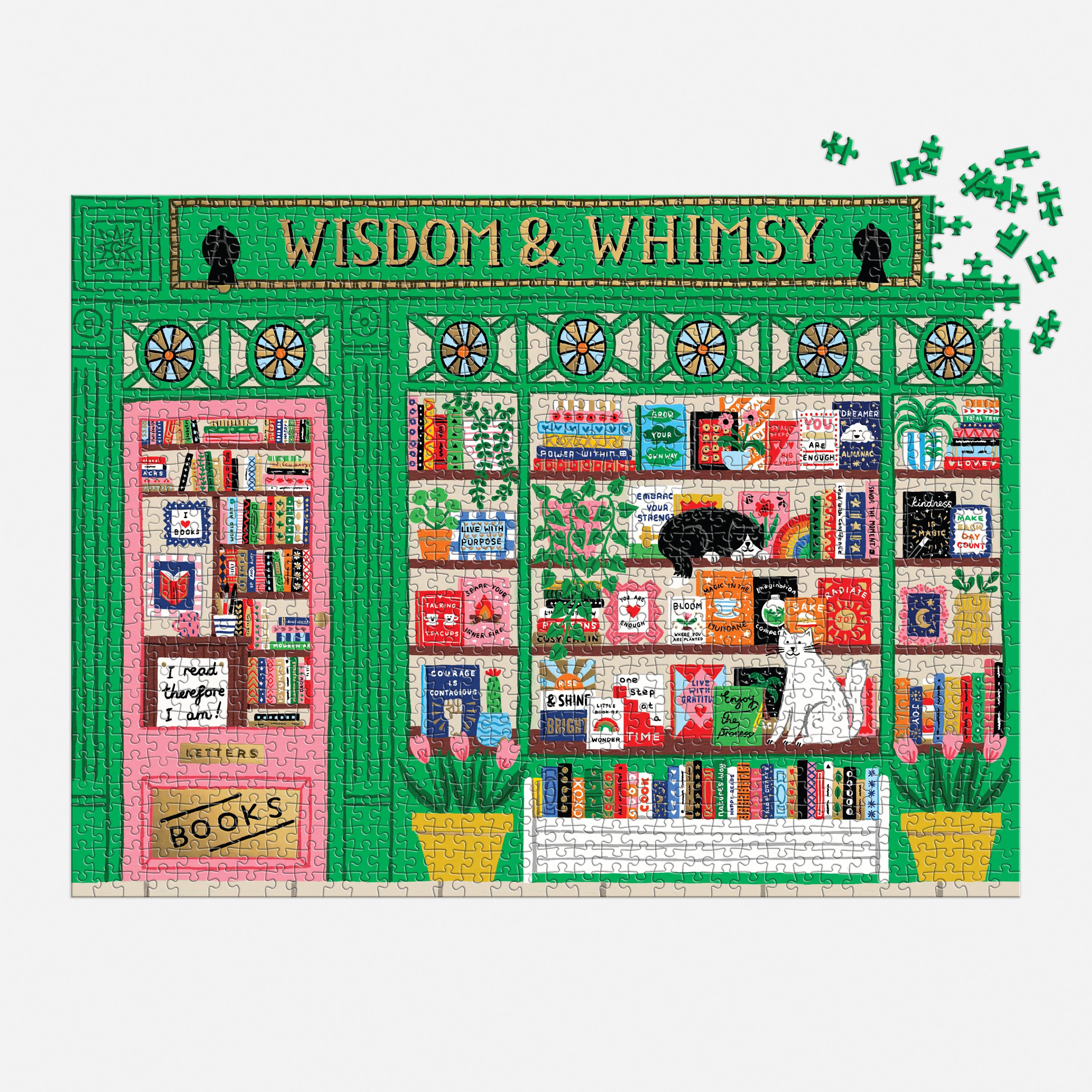 Lose yourself in the literary charm of this 1000-piece Wisdom & Whimsy Bookshop puzzle from Galison. Featuring a lush green storefront adorned with foil-accented details, gold-embossed spines, and hidden uplifting quotes, each piece reveals a cozy world of books and blooming florals. The ribbon-cut pieces fit smoothly together to create a stunning 69 cm x 51 cm finished artwork perfect for display. Crafted from 90% recycled greyboard with nontoxic inks, this eco-friendly puzzle combines mindfulness and artistry—ideal for book lovers, puzzle enthusiasts, and anyone seeking a creative escape.