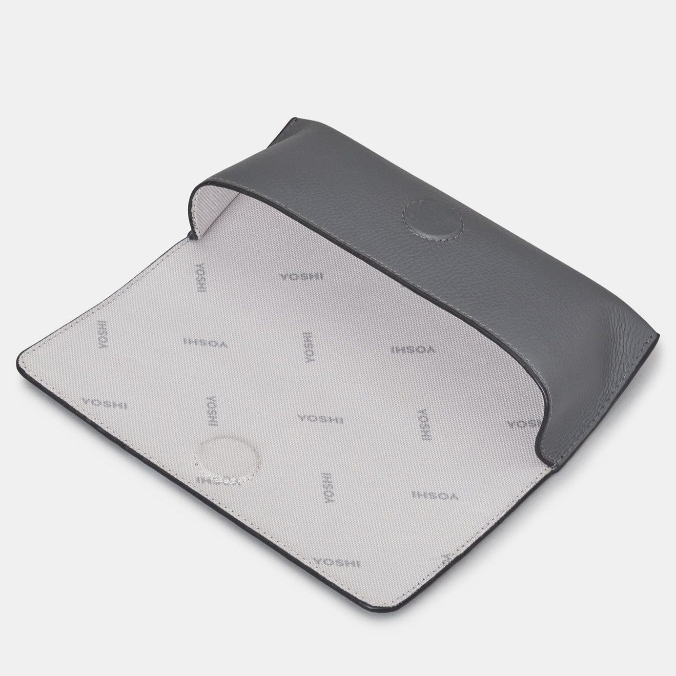 The glasses case is made from 100% grey leather with a structured design and a magnetic fastener.